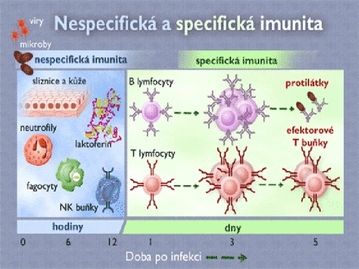 Nespecifické imunitní mechanismy * neadaptivní, vrozené * evolučně starší * nemají imunologickou paměť * na přítomnost škodlivin reagují rychle * složka buněčná – monocyty/makrofágy, granulocyty (neutrofilní, eosinofilní, bazofilní, mastocyty), NK bb. humorální – komplement, interferony, lektiny a další sérové proteiny
