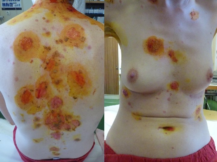 PACIENT 2 TO: v r. 2010 tvorbou vezikúl a erózií v ústnej dutine, neskôr aj na koži trupu a končatín. Histopatol a imunohistol – pemphigus vulgaris, 7/2010 hospitalizovaná, onko negat. , parciálna remisia na minimálnej terapii od 12/2010, V 3/2011 pacientka otehotnela, KS redukované na 10 mg/d 11. 12. 2011 pôrod SC zdravého dieťaťa 3. deň po pôrode novotvorba búl, stav kontrolovaný dávkou KS do 15 mg/d 3/2012 rehospitalizovaná pre relaps po „čínskej medicíne“ parciálna remisia na minimálnej terapii amenorea, cushing, leukopénia, recid. kvasinkové infekcie