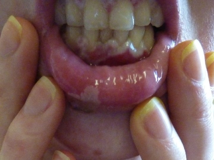 PACIENT 3 TO: 2/2013 tvorba hemoragických pľuzgierov a erózií v dutine ústne. Po 2 mesiacoch sa začali tvoriť ojedinelé pluzgiere na zapálenej spodine aj na trupe. V 6/2013 hospitalizovaná na kožnom oddelení, dexamethason, následne metylprednisolon 6 mg/d, histopatol najskôr pemphigus vulgaris, v 7/2013 KS ex. . . 14. 8. 2013 príjem pre rozsiahle erodované plochy na trupe, končatinách, v kapilíciu, enantémom v dutine ústnej, febrilitami, sťaženým prehĺtaním, dysfágiou