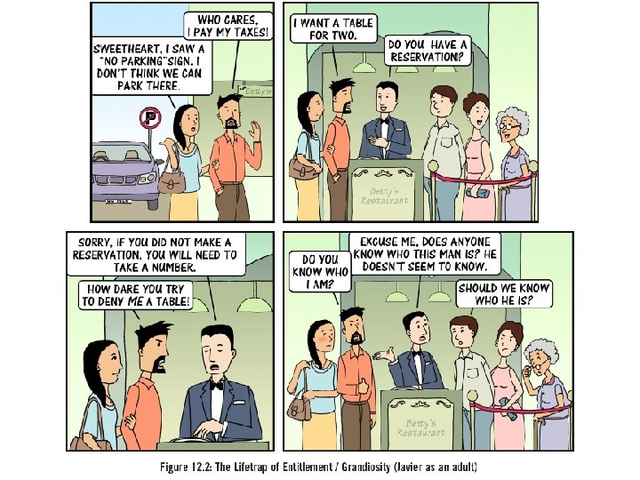 People with the Entitlement Lifetrap believe that what they want or need should always be a priority. It is okay for them to cheat on their spouse, and they minimize it. They do not need to fasten the seat belt when the plane is taking off, they can park illegally, and they generally get angry when they do not get their way.