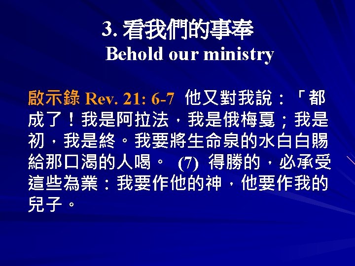 當我走完事奉的道路 我必看見主的榮光 榮耀的 主耶穌 祂必歡喜迎接我 When I finish walking the way of service I will see the glorious light of God Glorious, Lord Jesus, He will meet with me in great joy