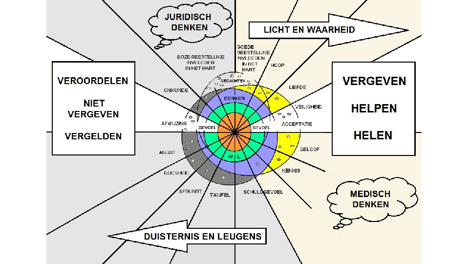 Het juridische denken in ons is bezig met negatieve gedachten over onszelf en anderen Het gaat hierbij over: zelfbeklag, wrok, boosheid, gevoelens van onrecht, veroordeling, onvergevingsgezindheid, het zoeken naar vergelding, Afgunst of jaloersheid, twijfel en schuldgevoelens.