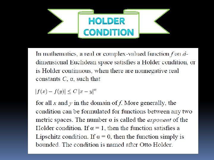 q. If 0 < α ≤ β ≤ 1 then all Hölder continuous functions on a bounded set Ω are also Hölder continuous. This also includes β = 1 and therefore all lipschitz continuous functions on a bounded set are also C 0, α Hölder continuous. q. The function defined on [0, 1] is not Lipschitz continuous, but is C 0, α Hölder continuous for α≥ ½ q. In the same manner, the function f (x) = xβ (with β ≤ 1) defined on [0, 1] serves as a prototypical example of a function that is C 0, α Hölder continuous for 0 < α ≤ β, but not for α > β. q. There are examples of uniformly continuous functions that are not α– Hölder continuous for any α. For instance, the function defined on [0, 1/2] by f(0) = 0 and by f(x) = 1 / log(x) otherwise is continuous, and therefore uniformly continuous by the. Heine-Cantor theorem. It does not satisfy a Hölder condition of any order, however. q. For α > 1, any α–Hölder continuous function on [0, 1] is a constant.