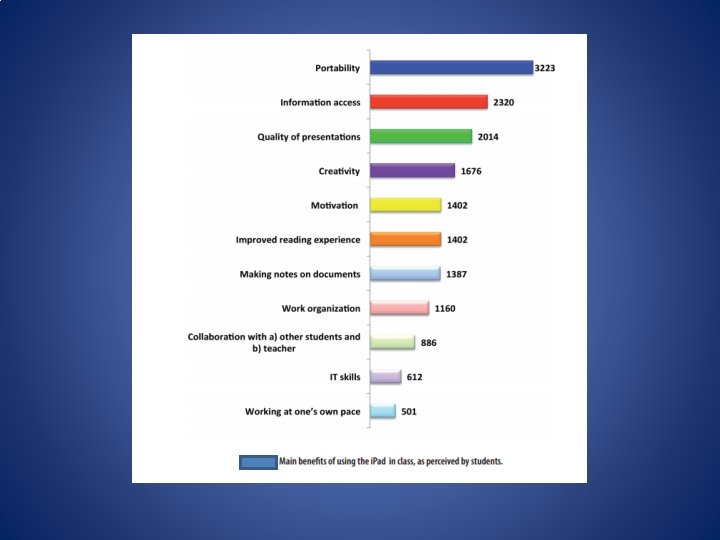 Studies and Surveys • 29% increased science test scores • 40% increase in knowledge of target words by preschoolers after using apps on i. Pads • 175% more students at advanced level math compared to students at similar schools without i. Pad • 95% increase in fourth grade student proficiency after i. Pads • 85% of primary teachers found students more motivated when learning with i. Pads
