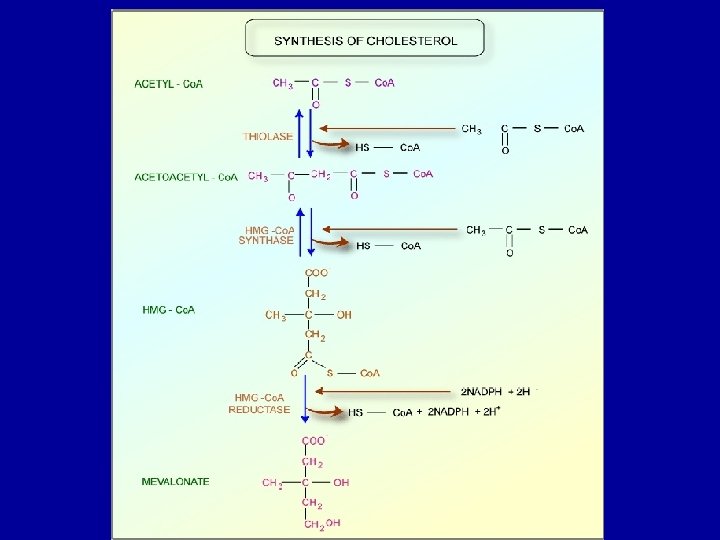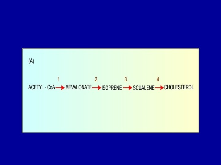 Cholesterol Biosynthesis - Cholesterol is a vital component of cell membranes and is the originator of the steroid hormones and bile salts. - Cholesterol is synthesized in the liver from acetate in a pathway that involves formation of HMG-Co. A from 3 molecules of acetate. -HMG-Co. A followed by reduction, phosphorylation, decarboxylation, and dehydration to form isoprene units isopentenyl pyrophosphate and dimethylallyl pyrophosphate. - 4 of these isoprene units are then condensed via cationic mechanism to form squalene. - Squalene in turn undergoes a cyclization reaction to form lanosterol, the originator to cholesterol.