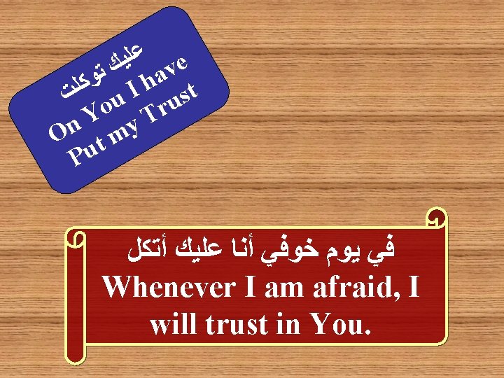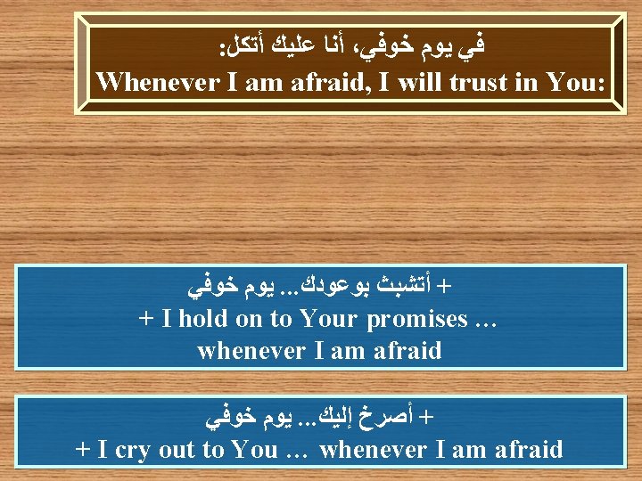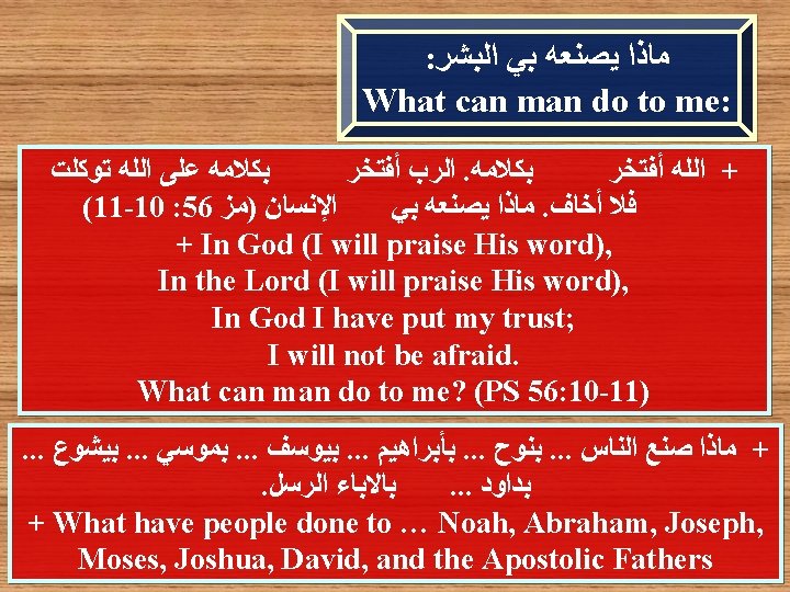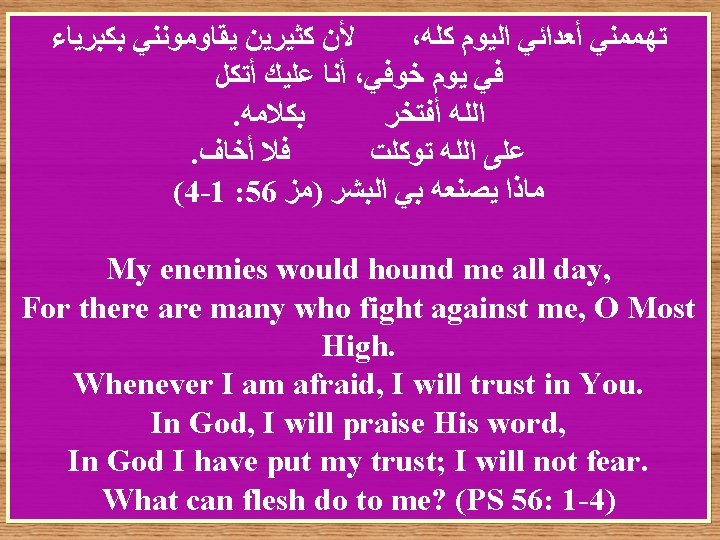 : ﺃﻮﻓﻲ ﺫﺑﺎﺋﺢ ﺷﻜﺮ ﻟﻚ I offer The sacrifice of thanksgiving to You ﺑﻜﻼﻣﻪ ﻋﻠﻰ ﺍﻟﻠﻪ ﺍﻟﺮﺏ ﺃﻔﺘﺨﺮ. ﺑﻜﻼﻣﻪ ﺍﻟﻠﻪ ﺃﻔﺘﺨﺮ + ﻋﻠﻲ ، ﺍﻟﻠﻬﻢ. ﺍﻹﻧﺴﺎﻥ ﻣﺎﺫﺍ ﻳﺼﻨﻌﻪ ﺑﻲ. ﻓﻼ ﺃﺨﺎﻑ ﺗﻮﻛﻠﺖ ﺃﻮﻓﻲ ﺫﺑﺎﺋﺢ ﺷﻜﺮ ﻟﻚ. ﻧﺬﻭﺭﻙ (12 -10 : 56 )ﻣﺰ + In God (I will praise His word), In the Lord (I will praise His word), In God I have put my trust; I will not be afraid. What can man do to me? Vows made to You are binding upon me, O God; I will render praises (I offer The sacrifice of