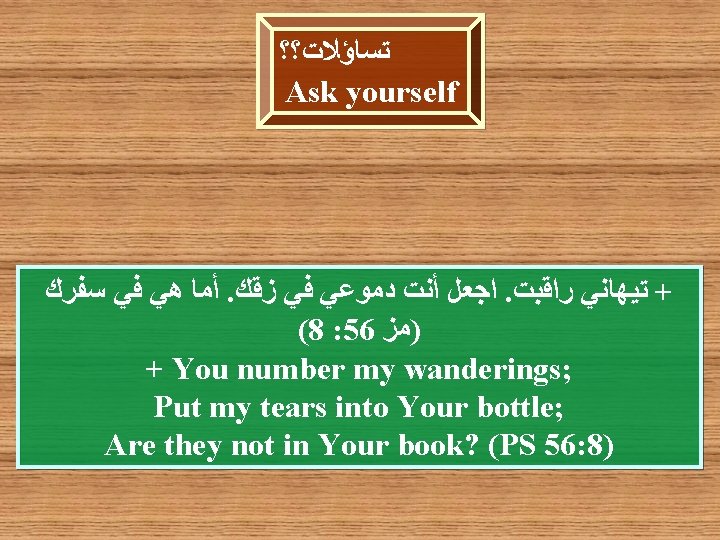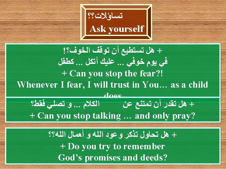 ﺗﺴﺎﺅﻼﺕ؟؟ Ask yourself ! ﻫﻞ ﺗﺮﺻﺪ ﺍﻟﺨﻮﻑ؟ +. . . ﺃﻮ ﻗﻠﻖ. . . ﺃﻮ ﺣﺰﻥ. . . ﻳﺄﺘﻲ ﻣﻌﻪ ﻏﻀﺐ ﺳﻼﻡ ﻭ ﺃﻀﻄﺮﺍﺏ!؟ ﺩﺍﺋﻤ ﻋﺪﻡ ﻭ + Do you watch closely your status of fears? ! It comes with anger…. grief… or anxiety … And is it always accompanied with absence of peace and leaves you deeply troubled!?