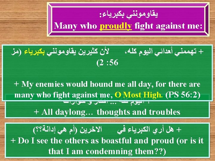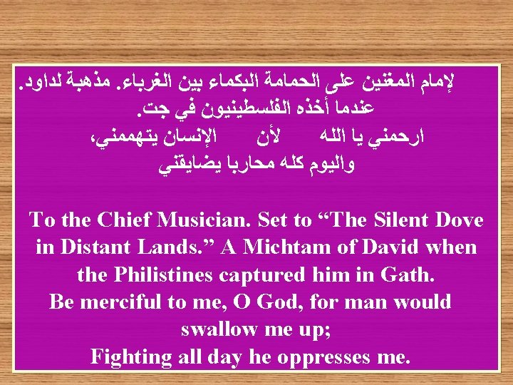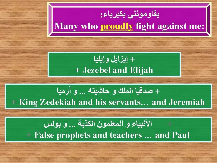 : ﺑﻜﻼﻣﻪ ﺍﻟﻠﻪ ﺃﻔﺘﺨﺮ In God, I will praise His word: : ﻷﻨﻚ ﻗﻠﺖ ﻟﻲ ﺃﻔﺘﺨﺮ I am proud of Your word and praise it because You told me: . ﻟﻴﺮﺗﺪ ﺇﻟﻰ ﺧﻠﻒ ﻭﻳﺨﺠﻞ ﺍﻟﻤﺸﺘﻬﻮﻥ ﻟﻲ ﺷﺮﺍ. ﻟﻴﺨﺰ ﻭﻳﺨﺠﻞ ﻃﺎﻟﺒﻮ ﻧﻔﺴﻲ + (2 : 70 )ﻣﺰ + Let them be ashamed and confounded Who seek my life; Let them be turned back and confused Who desire my hurt. (PS 70: 2)