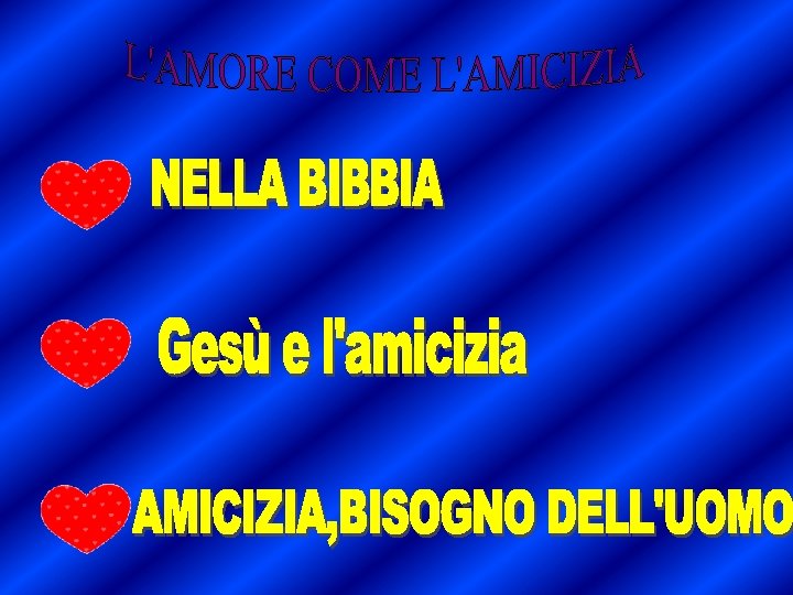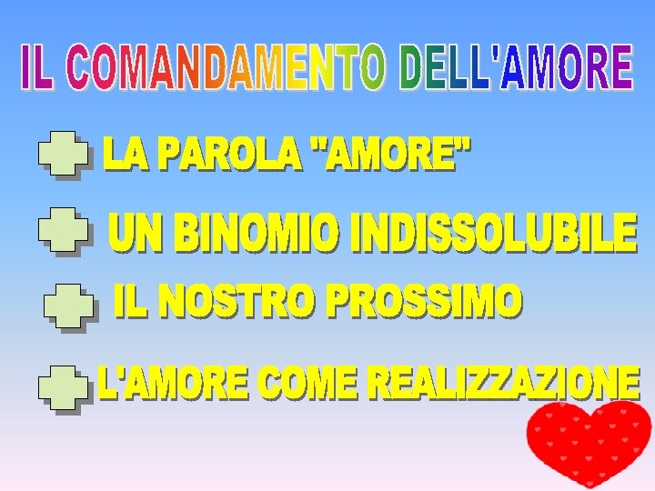 In italiano la parola AMORE viene usata con diversi significati, invece nel nuovo testamento: • La relazione d’affetto, d’amore e di amicizia viene chiamata PHILIA • L’amore fisico e passionale viene chiamato EROS • L’amore-carità viene chiamato AGAPE