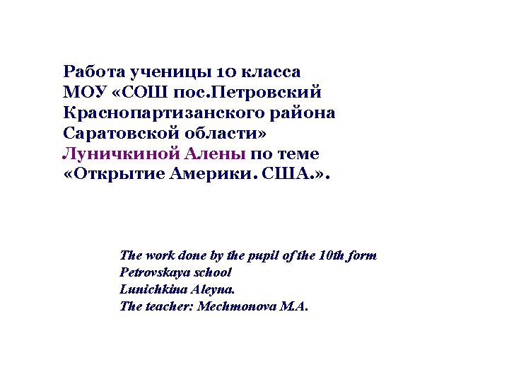 QUESTIONS: 1. What is a popular name for the United States of America? 2. Who are the natives of the USA? 3. When did the Americans begin to celebrate Thanksgiving Day? 4. Why are the names of some places Spanish? 5. What is the national capital of the United States? 6. What Statue is the symbol of New York and the United States? Whose gift was it? 7. What other languages do the Americans speak? 8. What other big cities of the United States do you know? 9. How many stars are there on the national banner of the United States of America. What does each star represent? 10. What can you say about the climate of the USA? 11. What natural resources has the USA?