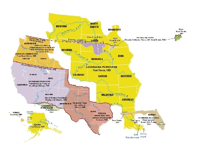 In the 1840 s, America realized its “manifest destiny” by acquiring all lands to the Pacific Ocean In 1845, the USA annexed the independent nation of Texas In 1846, the U. S. settled a dispute with England to gain Oregon In 1848, the USA gained new lands in the SW by winning the Mexican. American War