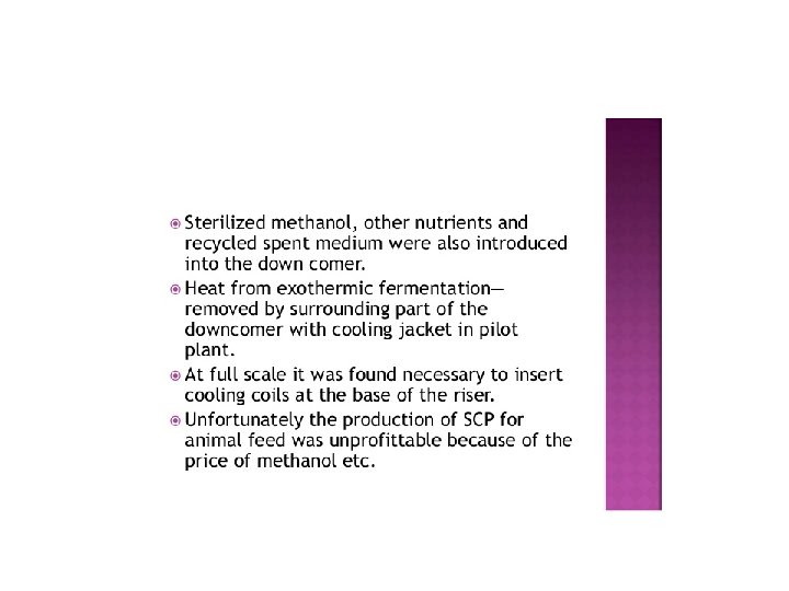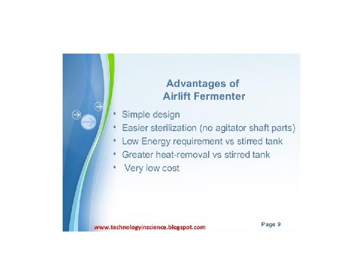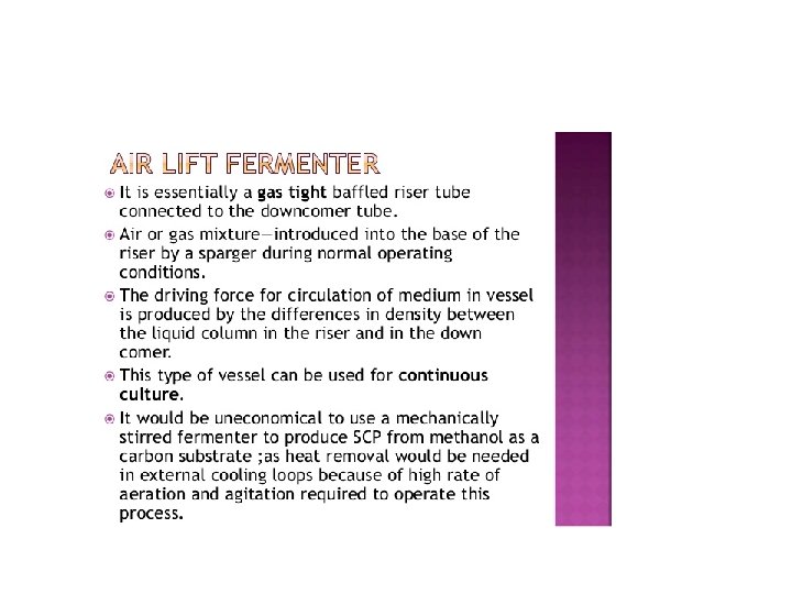 • Airlift bioreactors are commonly employed for aerobic bioprocessing technology. • They ensure a controlled liquid flow in a recycle system by pumping. Due to high efficiency, airlift bioreactors are sometimes preferred e. g. , methanol production, waste water treatment, single-cell protein production. • In general, the performance of the airlift bioreactors is dependent on the pumping (injection) of air and the liquid circulation.