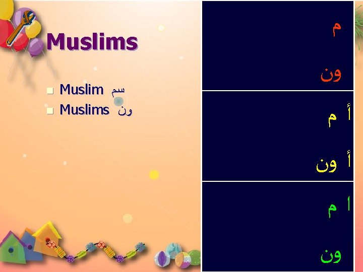 Let us Practice at least 3 times n To make Allah happy; with understanding; and with feelings (that we want to follow Prophet Muhammad; We want to follow him in everything. From now on, we want to obey Allah, be nice to mummy and daddy, brothers and sisters, to friends, to teachers, study well, and do good things) ﺍﻳ `alay-him on them; 'an-`amta Practice 3 times You (have) bestowed favors ﺍ Širaa¨al la’eena (of) those (The) path