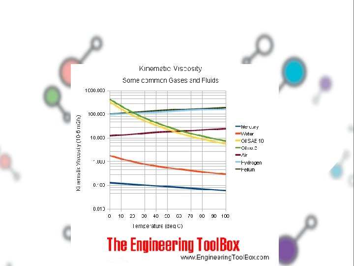 Viscosity and Temperature • Kinematic viscosity of liquids like water, mercury, oils SAE 10 and oil no. 3 - and gases like air, hydrogen and helium are indicated below. Note that • for liquids viscosity decreases with temperature • for gases viscosity increases with temperature