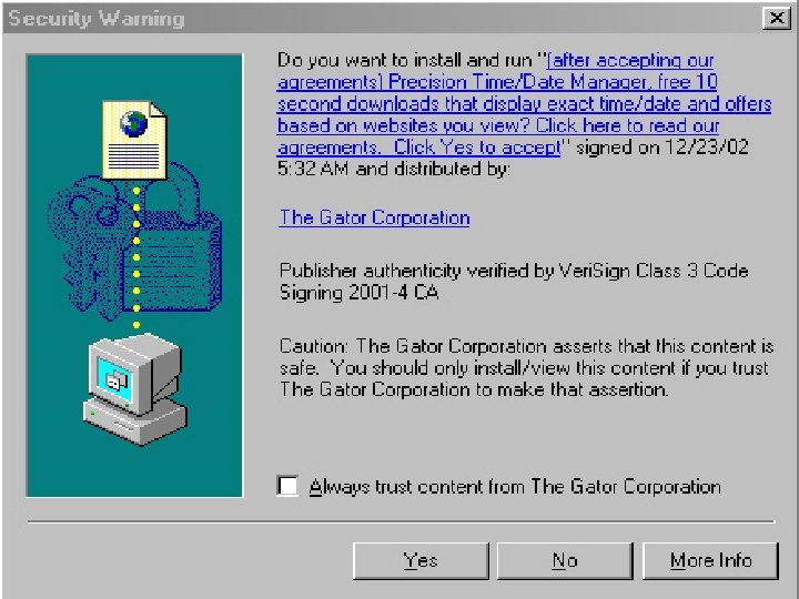 Spyware & Antispyware Gator (GAIN) �Gator is an adware program that may display banner advertisements based on user Web surfing habits. � Gator is usually bundled with numerous free software programs, including the popular file-sharing program Kazaa.
