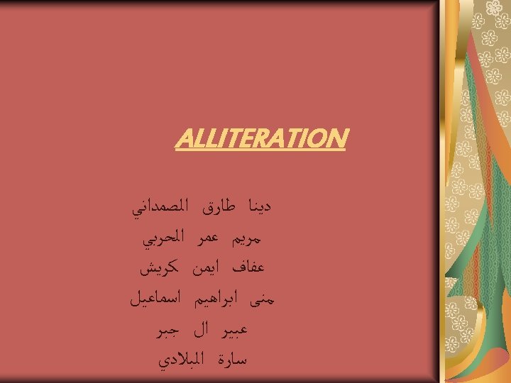 In the name of Allah we well start What is the definition of alliteration? l Examples about alliteration! l What is the purpose of the alliteration? l The writer who were known in this from is, , , l l The poem Baseball Key word! Images summary