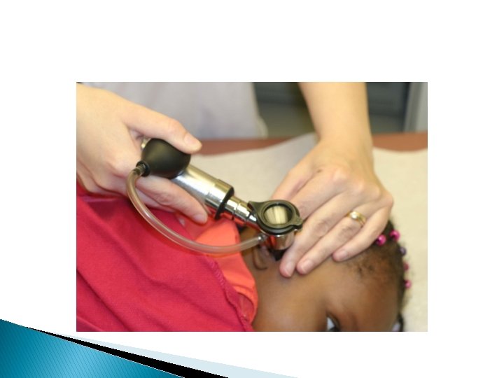 Signs of presence of MEE �Pneumatic otoscopy ◦ Reduced or absent mobility of the tympanic membrane is additional evidence of fluid in the middle ear �Tympanometry reflectometry or acoustic ◦ Can be helpful in establishing a diagnosis when the presence of middle-ear fluid is difficult to determine