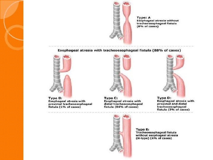 What other congenital anomalies are associate with TE fistula or atresia? �Associated anomalies occur in 30 -50% of cases. �Most common: cardiovascular anomalies genitourinary anomalies imperforated anus other intestinal athresia neurologic anomalies orthopedic anomalies
