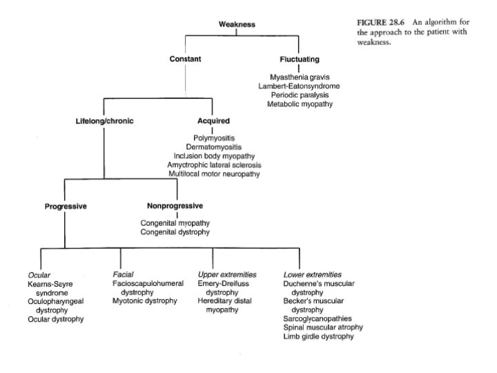 Approach to EDB hypertrophy with lower LG weakness l Chronic peripheral neuropathy. l Anterior horn cell disease. l Chronic myopathy with proximal weakness. l Muscular dystrophies with proximal weakness.