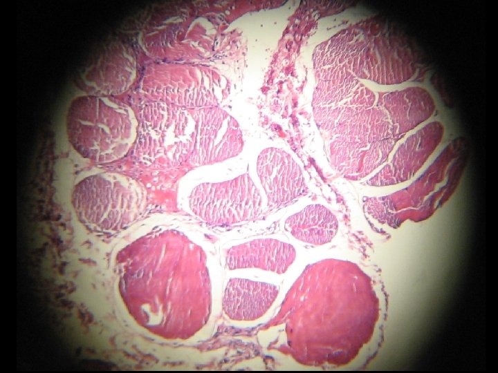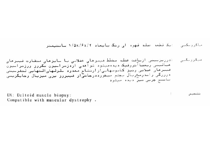 MUSCLE BIOPSY AND PATHOLOGICAL FINDING l l l Fiber size variability. Fiber degeneration (necrosis) and regeneration. Fiber splitting. Fiber atrophy and hyaline changes. Mild lymphocytic infiltration (privascular and endomesial). Perimesial fibrosis and replacing with fat tissue. These findings are in favor of muscular dystrophy.