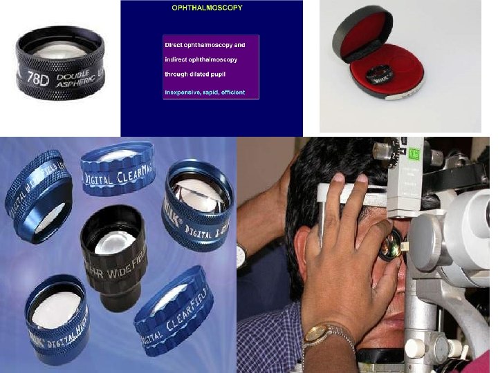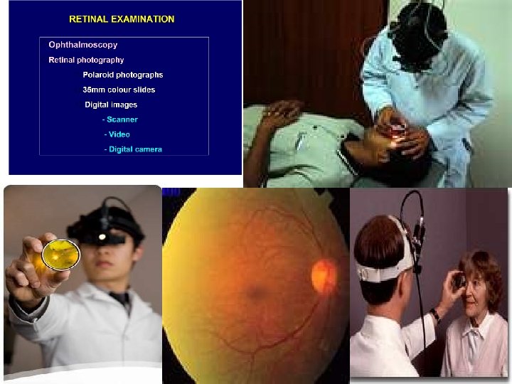 Evaluation of retina & optic nerve Visual field: Confrontation, tangent screen