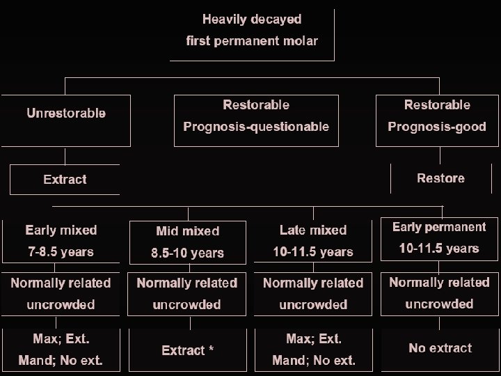 FACTORS TO CONSIDER WHEN PLANNING EXTRACTION OF FIRST PERMANENT MOLARS �the restorative state of the tooth �presence and condition of the other teeth � dental age of the patient �the occlusal relationship Dental update 2001