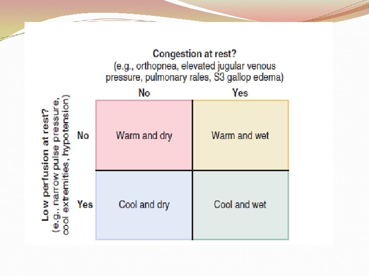 P/E �Findings suggesting reduced cardiac output include poor mentation, reduced urine output, mottled skin, and cool extremities. Of these, cool extremities are the most broadly useful. �Assessment for systemic congestion, taken together with evaluation for reduced cardiac output, may be useful to separate patients with HF into 4 categories: �“dry/warm” (uncongested with normal perfusion) �“wet/warm”(congested with normal perfusion): most common in DHF �“dry/cold”(uncongested but hypoperfused) �“wet/cold” (cardiogenic shock)