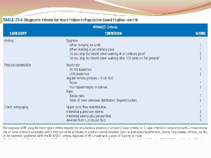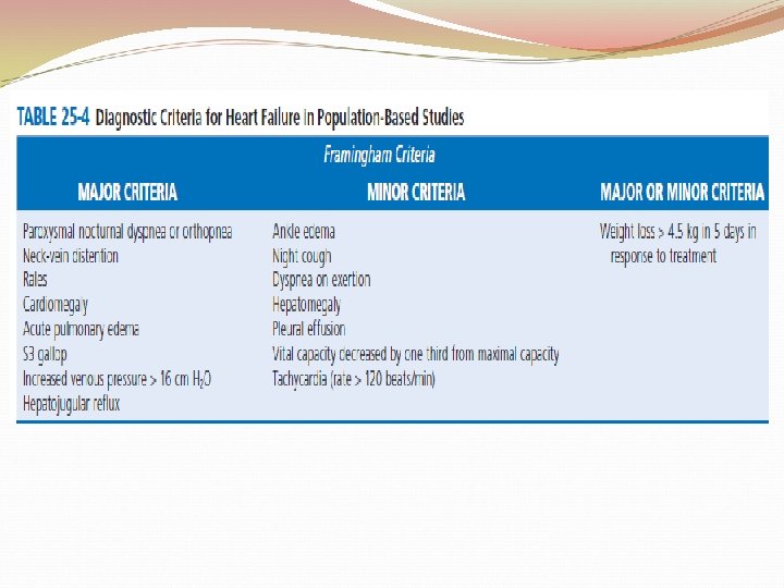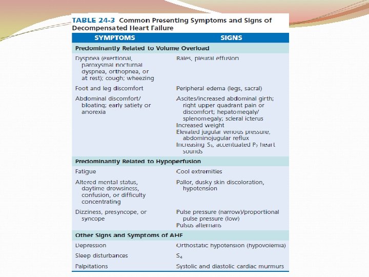 Dyspnea �Worsening dyspnea is a cardinal symptom of HF and typically is related to increases in cardiac filling pressures but also may represent restricted cardiac output. �The absence of worsening dyspnea, however, does not necessarily exclude the diagnosis of HF, because patients may accommodate symptoms by substantially modifying their lifestyle.