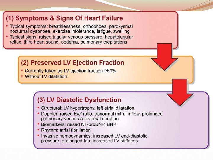 HF definition �Heart failure (HF) is a complex clinical syndrome resulting from structural and functional impairment of ventricular filling or ejection of blood �Most patients have impairment of myocardial performance, with findings ranging from normal ventricular size and function to marked dilation and reduced function. �Although symptoms of HF frequently depend on the presence of elevated left- or right-sided heart filling pressures, the designation “congestive” in this context is no longer preferred