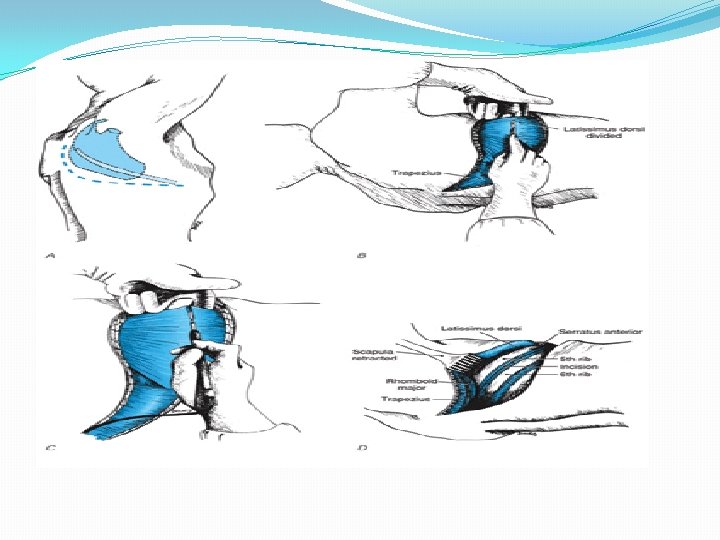 �The skin incision : No. 10 scalpel � latissimus dorsi and serratus anterior muscles : No. 10 scalpel or cautery �Posteriorly, the muscle layers of the rhomboid and trapezius are incised �The pleural space : incising the musculature between the ribs or via an osteotomy �transect the muscles on the superior border of the ribs to avoid injuring the neurovascular bundle. �ribs may be transected or resected