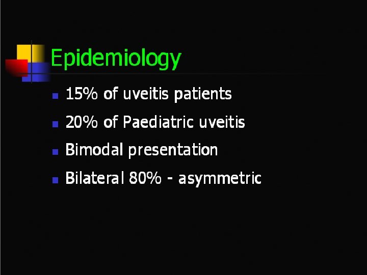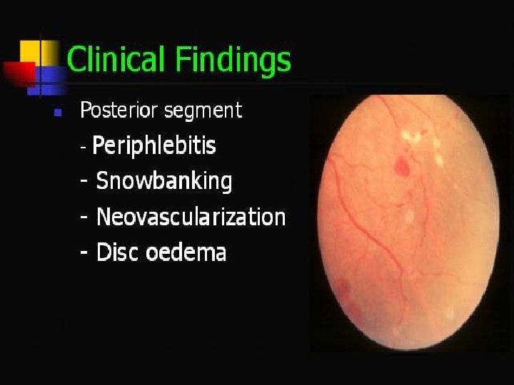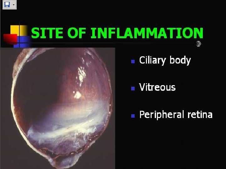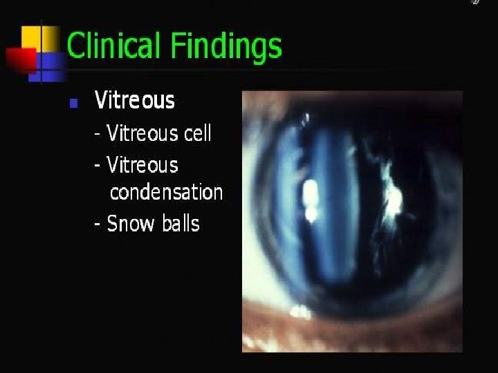 Pars planitis • Most commonly affects persons 5 -40 years of age • 5 -15 years, and 20 -40 years • Autoimmune reaction against vitreous, peripheral retina and ciliary body • Presents with significant inflamation in AC in childeren, and floaters in young adults