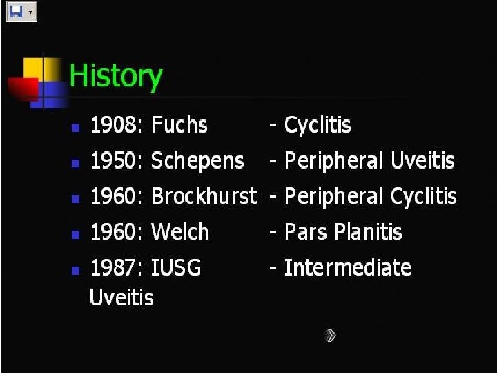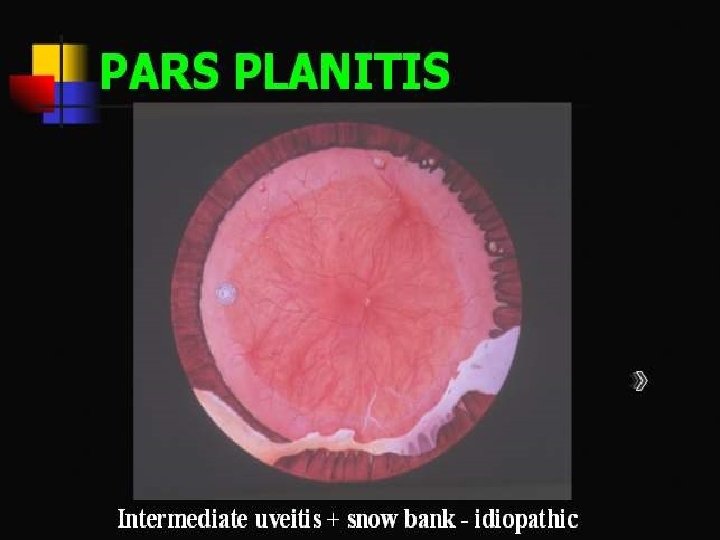 Pars planitis • It is the most common form of intermediate uveitis constituting approximately 85%-90% of cases • Intermediate uveitis when there is snow bank or snow ball formation in the absence of associated infection or systemic disease • The cause is unknown