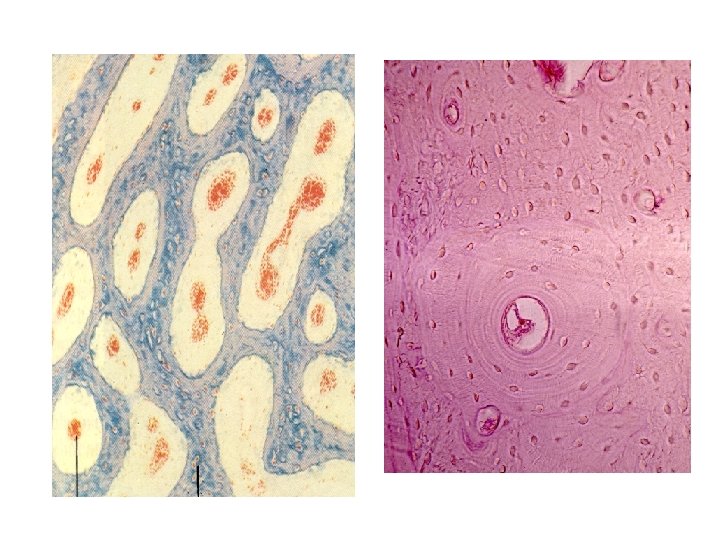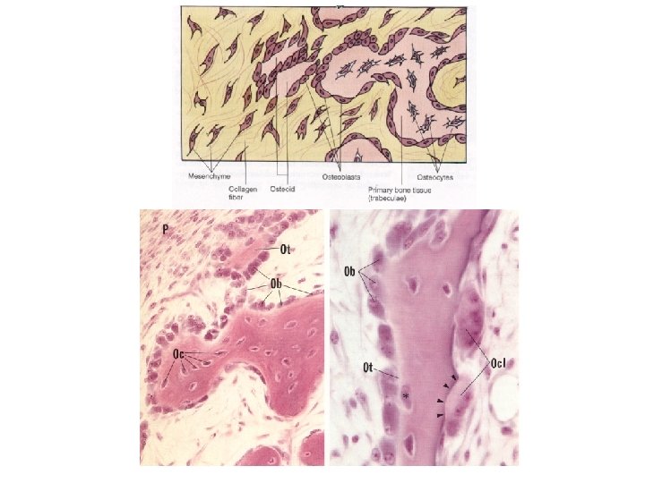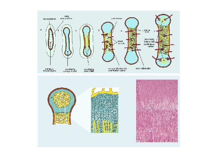 Primary Center Events ÔBone collar stops diffusion of nutrients to chondrocytes in cartilage template and causing them to die ÔThe lacunae becomes empty, confluents and forming large cavities ÔOsteoclasts makes holes in bone collar and permit osteogenic bud enter the cavities in cartilage model ÔOsteogenic bud is composed of osteoprogenitor cells, hemopoietic cells and blood vessels ÔOsteoblasts secrete bone matrix on the surface of calcified cartilage forming calcified cartilage – bone complex ÔCalcified cartilage is basophilic (blue) and new bone is acidophilic (pink)