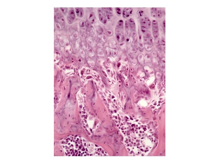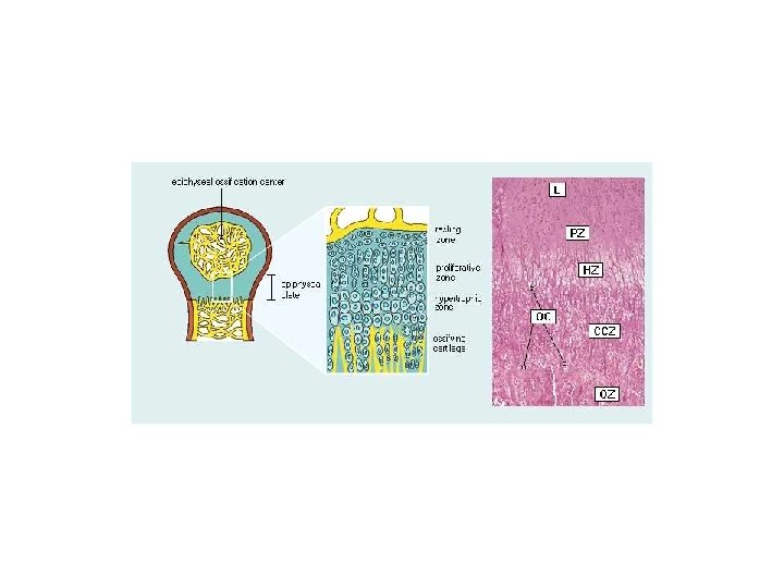 Zones of Epiphyseal Plate Û Resting zone (Reserve zone): chondrocytes show mitotic figure and randomly distributed in hyaline cartilage Û Proliferative zone: rapidly dividing chondrocytes form columns of stacked cells Û Hypertrophied cartilaginous zone: chondrocytes mature accumulate glycogen in cytoplasm, and hypertrophied Û Calcified cartilage zone: chondrocytes dying, deposition of hydroxy apatite in matrix Û Ossification zone: endochondral bone appears, vessels invade from periosteum, osteoblasts deposit calcified bone matrix on calcified cartilage followed by resorption of this complex