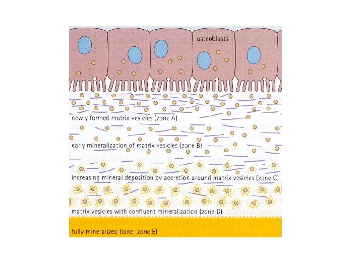 Mechanisms of Calcification v. Not completely understood v. Alkaline phosphatase causes accumulation of phosphate for precipitation of hydroxy apatite crystals v. Calcium binding glycoproteins secreted v. Vesicles in osteoblasts accumulate calcium and phosphate for calcification