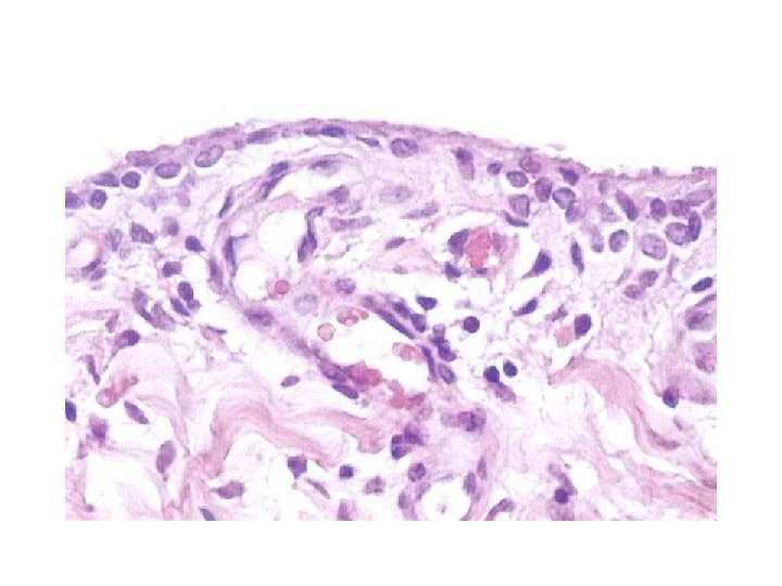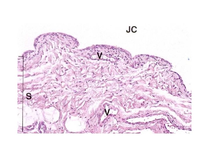 Synovial joints ØSynovium produce synovial fluid and composed of 1 -4 layers of cells ØCells vary from flat to cuboidal or polyhedral in shape ØTwo cell types defined: -Type A are phagocytic and have numerous lysosomes - Type B have abundant RER and produce protein ØThese layers of cells supported by a loose fibrocollagenous tissue containing adipocytes, mast cells, fibroblasts and macrophages