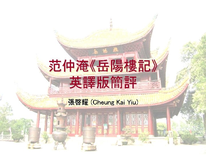 第一段 • 越明年,政通人和,百廢具興。 • In the second year of his office, because of his excellent administration, people lived in peace and contentment, and all previous neglected matters were taken care of. • 修改建議: • After a year, his excellent rule gained people’s contentment and brought the ruined society back to prosperity.