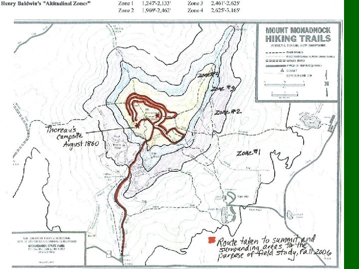 The route taken on each of 3 days in the field in search of Thoreau’s plant taxa (Fall-2006) • Paradise Valley Trail • Summit Area • Thoreau’s campsite (1860)