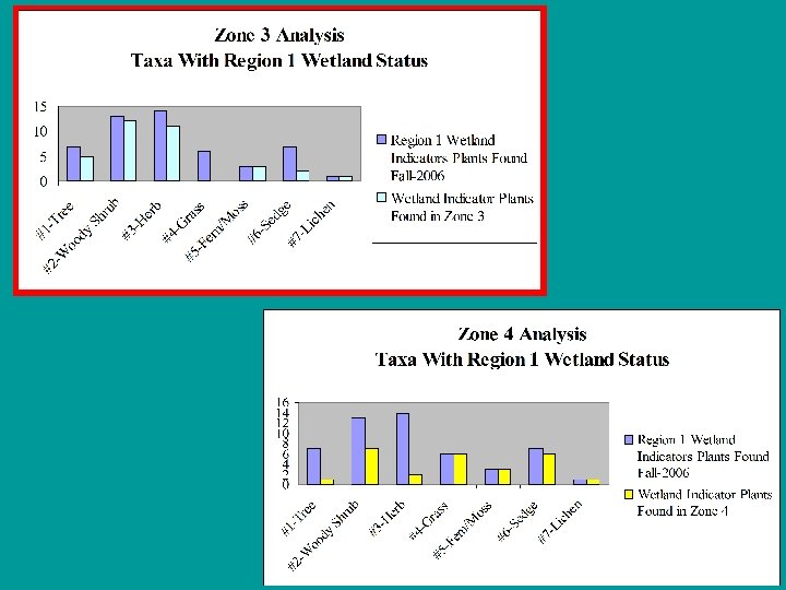 A pattern revealed…. . Zone 3…Of critical importance to Mt. Monadnock’s ecological health? A breakdown of taxa types in each altitudinal zone revealed the following pattern: • Trees are most dominant in Zone 2; • Woody shrubs, Zone 3; • Herbs, Zone 3; • Grasses, Zone 4; • Ferns and Mosses, Zones 3 and 4, equally; • Sedges, Zones 3 and 4, with a predominance in Zone 4; • Lichens, Zones 3 and 4, equally.
