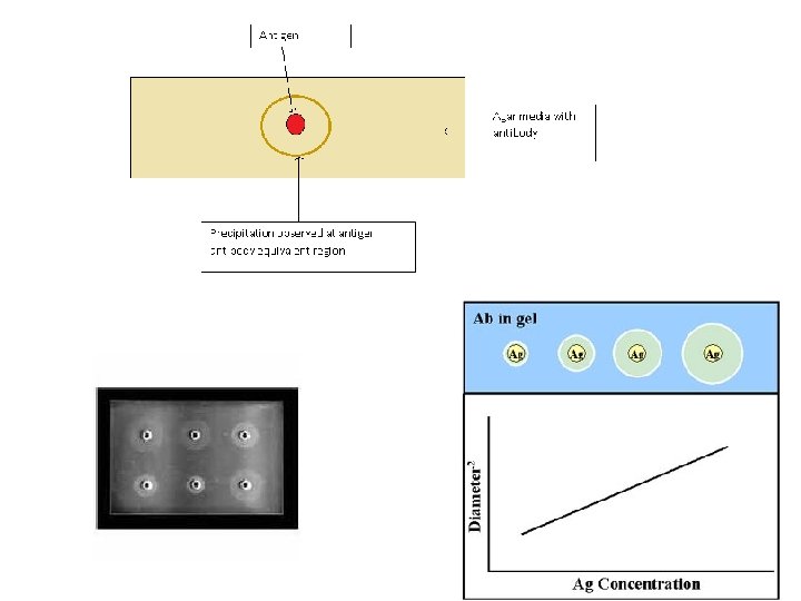 Antigen-Antibody interactions Types of Precipitation In gel Single radial immunodiffusion Single diffusion in two dimensions (Radial immunodiffusion) - Ab incorporated in agar gel - Ag. added to wells in agar. - Ag. diffuses radially from the well - Forms precipitation ring around antigen