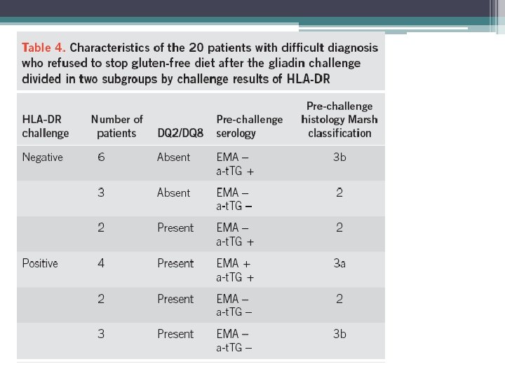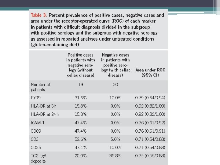• Analyses were repeated after exclusion of treated celiac patients to investigate the possible confounding of treatment with GFD. Area under the ROC for HLA-DR was the highest one also in this set of analyses (area under ROC=0. 99). • Findings for other markers were similar to data of table 2 with exception of TG 2–Ig. A. The area under the ROC of TG 2–Ig. A increased up to 0. 90 after exclusion of treated celiac patients. • Analyses were done also focusing on blank samples to investigate the accuracy of the expression of these markers without the incubation with gliadin. For all markers, the area under the ROC was much lower than values found with the use of the gliadin challenge. The highest value was found for the area under the ROC of HLA-DR 24 h (0. 71), the lowest value for the area under the ROC of TG 2–Ig. A (0. 64). • The inaccuracy of immunofluorescence assessment in blank samples mainly reflected a high number of falsenegative cases.