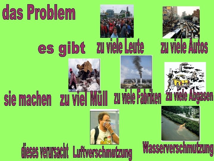1. mit dem Auto fahren 2. mit dem Rad fahren 3. Cola Dosen recyceln 4. Flaschen recyceln 5. den Fernseher auf Stand-by lassen 6. zu Fuß gehen 7. das Licht ausmachen 8. duschen 9. baden Extension: can you think of other similar phrases? E. g. mit dem Bus fahren