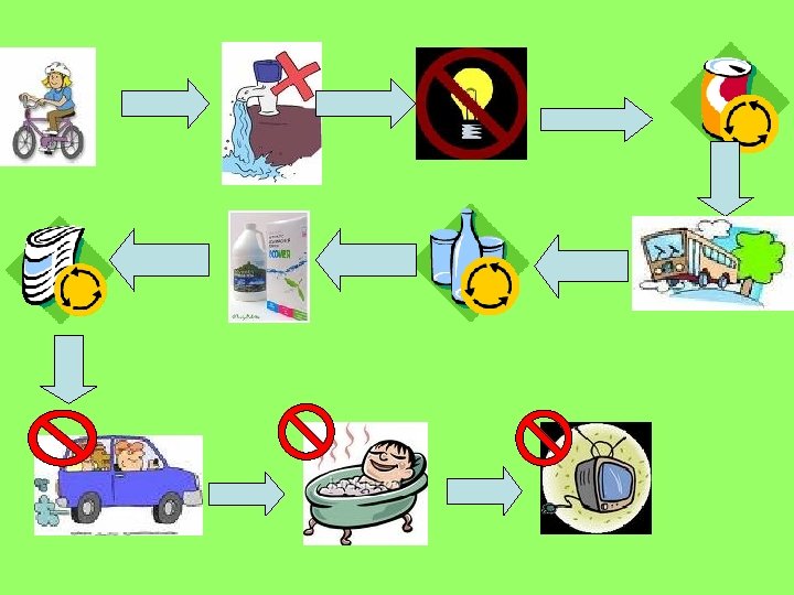 Gut für die Umwelt (umweltfreundlich) mit dem Rad fahren zu Fuß gehen das Licht ausmachen Cola Dosen recyceln Flaschen recyceln duschen Schlecht für die Umwelt mit dem Auto fahren baden Fernseher auf standby lassen