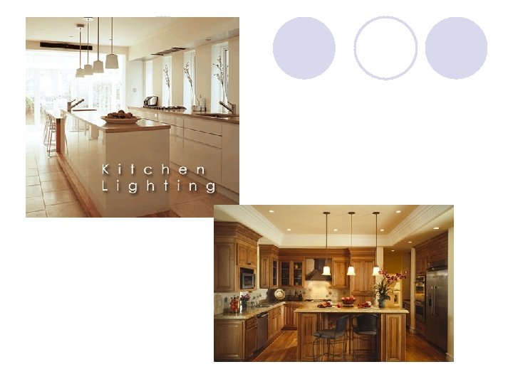 Kitchen Lighting l Kitchen lighting is an important part of any kitchen design. In order to be effective in the kitchen, you need to be able to see well. Though the need for lighting in this area is obvious, choosing the right lighting can be very confusing for many. l Does the kitchen get any natural light? Does it catch morning, afternoon or evening sun? Are there shadows cast? If there is no natural light how is light brought to the work space? What type of lighting fixtures will be used and what type of bulb will they require? l Consider using under cabinet or inset lighting for countertops. Pot and recessed lighting can create a soft light and combined with dimmers will provide adequate task lighting and fantastic ambiance. Xenon lighting is replacing halogens as a softer alternative to help eliminate the shadow effect traditionally cast by halogen bulbs.
