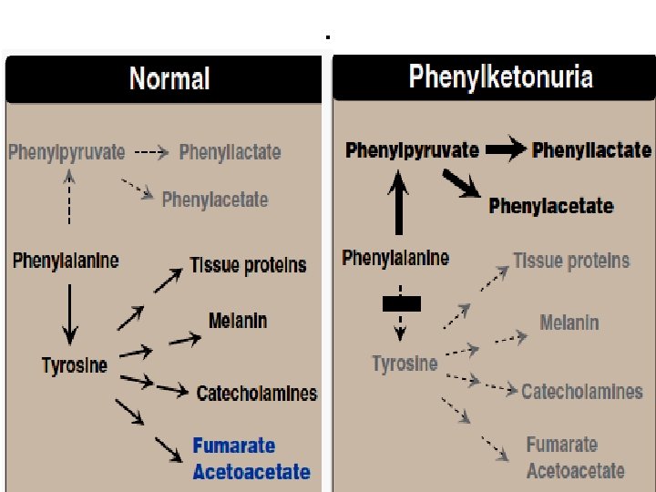 ENZYMATIC ACTIVITY • In cases of PKU, the enzyme that breaks down phenylalanine, phenylalanine hydroxylase, or of its tetrahydrobiopterin cofactor which may be completely or nearly completely deficient. • This enzyme normally converts phenylalanine to another amino acid, tyrosine, which is utilized by the body. • When this enzyme, is absent or deficient, phenylalanine and its breakdown chemicals from other enzyme routes, accumulate in the blood and body tissues.