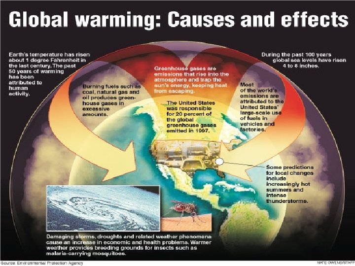 Efectele incalzirii globale asupra mediului inconjurator si a vietii oamnilor sun numeroase si variate. Crestera nivelului marilor si oceanelor, topirea ghetarilor si a calotelor polare, dereglarea standardelor in agricultura. Acestora li se alatura fenomene meteorologice extreme, expansiunea bolilor tropicale, toate acestea avand un impact drastic asupra economiei.
