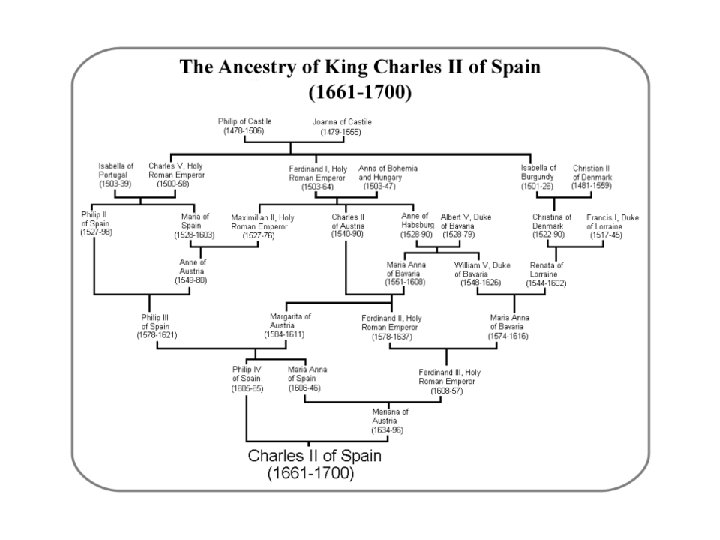Inbreedign euro royalty Serious inbreeding among European Royals (max at 7 generations = 128 ancestors) Generations 4 5 6 7 Ift de Espana (1901 -1964) 8 12 12 12 Gottfried of Tuscany (1901 -) 8 10 15 18 Alfonso XII King of Spain (1857 -1885) 4 4 6 8 Francesco, Duke of Marchena (1861 -1923) 2 4 8 8 Maria Antonia of Austria (1669 -1692) 4 4 6 10 Louis XV King of France (1710 -1774) 4 8 12 16