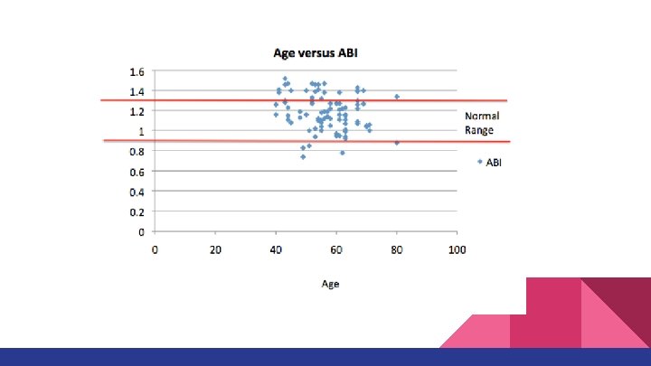 Results Normal ABIs (ABI 0. 9 -1. 3): 63% Abnormal ABIs showing elevated values (ABI >1. 3): 28% Abnormal ABIs showing mild disease (ABI 0. 7 -0. 9): 9% 33% of smokers had abnormal ABIs, while 38% of non-smokers had abnormal ABIs 75% of men had abnormal ABIs, while 8% of women had abnormal ABIs