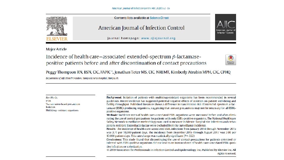 Incidence of HAI ESBL + patients before and after discontinuation of contact precautions American Journal of Infection Control 48 (2020) 52− 55 (January 2020) Incidence of health care−associated extended-spectrum b-lactamase positive patients before and after discontinuation of contact precautions Peggy Thompson RN, BSN, CIC, FAPIC *, Jonathan Teter MS, CIC, NREMT, Kimberly Atrubin MPH, CIC, CPHQ By Regina Livshits, RN, MCN, CIC, ONC, IIWCC, NYU Langone Health, Infection Prevention & Control Dept.