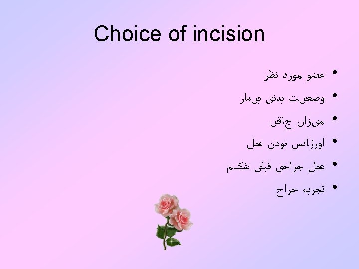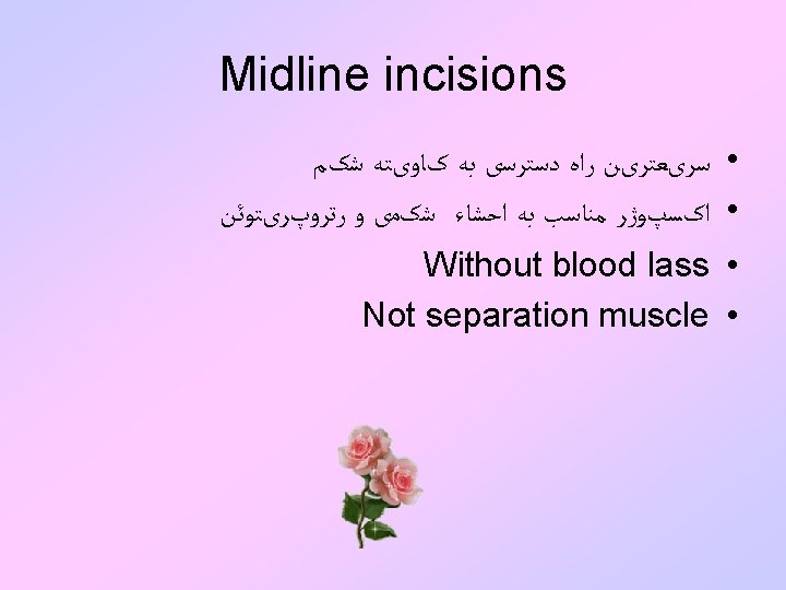 Types of incision : ﺩﺳﺘﻪ 4 • • A- Vertical B- Transverse and oblique C- Abdominothoracic D- Retroperitoneal or extraperitoneal